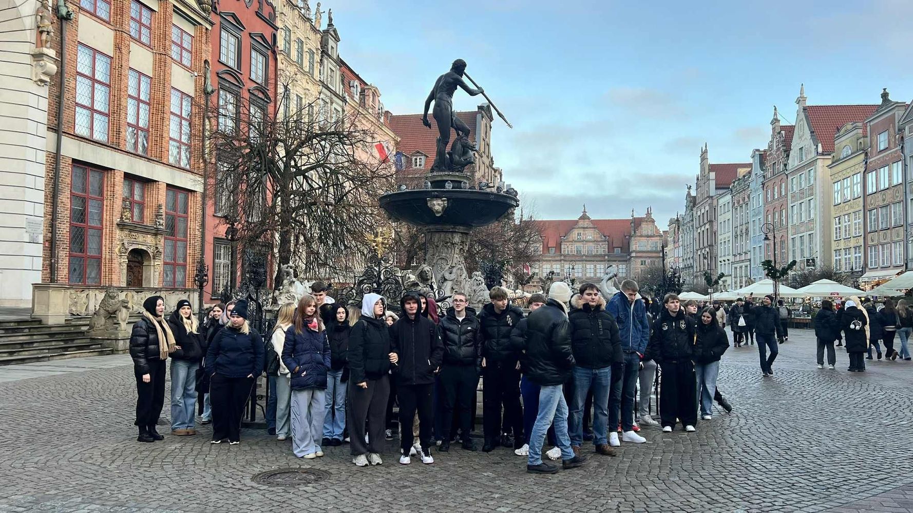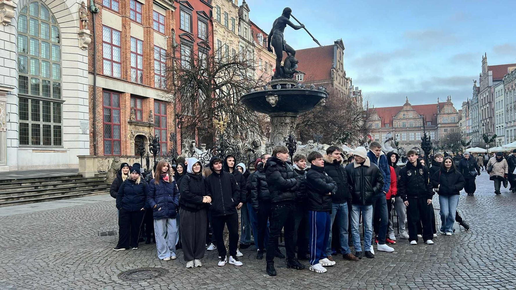 Po zakończonym zwiedzaniu grupa udała się na spacer ulicami Gdańska. Trasa prowadziła przez tereny postoczniowe, następnie w kierunku Starego Miasta. Po drodze można było podziwiać charakterystyczne gdańskie kamienice, fontannę Neptuna oraz malowniczy Długi Targ. W powietrzu unosił się zapach grzanego wina i cynamonu, który zapowiadał, że zbliżamy się do celu – jarmarku bożonarodzeniowego.