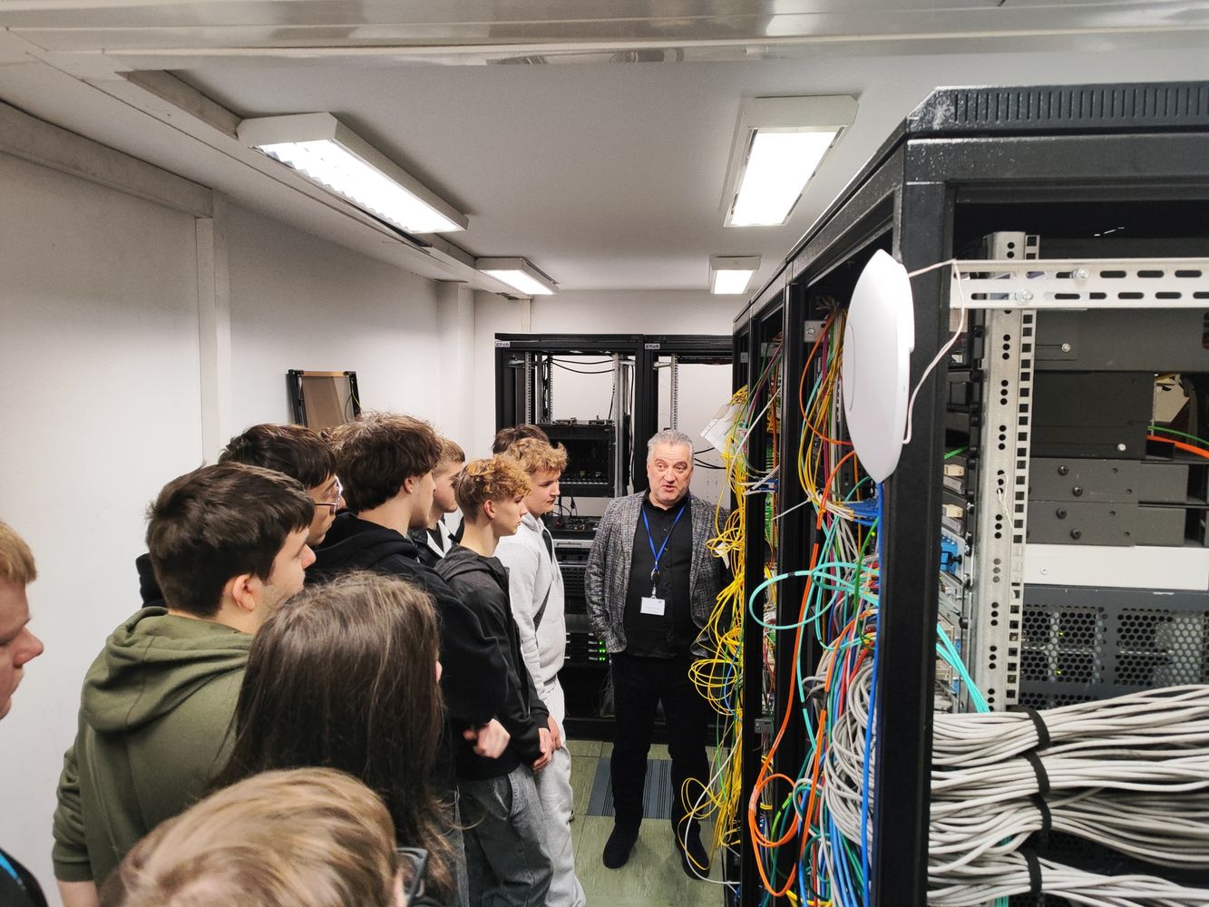 Kolejnym punktem programu było zwiedzanie serwerowni, podczas którego dr Grzegorz Śliwiński w interesujący sposób opowiedział o jej funkcjonowaniu, bezpieczeństwie danych oraz znaczeniu infrastruktury informatycznej w codziennej pracy uczelni.