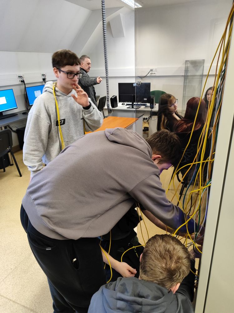 Następnie uczniowie uczestniczyli w zajęciach praktycznych w laboratorium sieci MikroTik. Była to doskonała okazja do zdobycia nowych umiejętności oraz poszerzenia wiedzy z zakresu konfiguracji i zarządzania sieciami komputerowymi w warunkach zbliżonych do rzeczywistych.